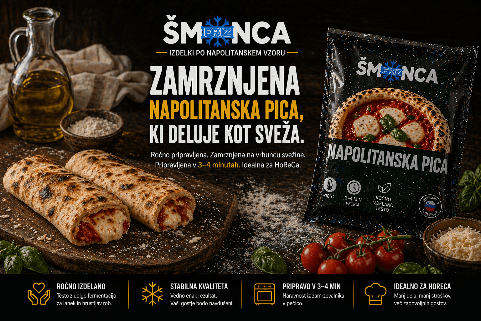 Posebnost naših produktov je priprava testa po napolitanskem vzoru. Testo je fermitirano 48 ur, s čimer dosežemo lahko prebavljivost.